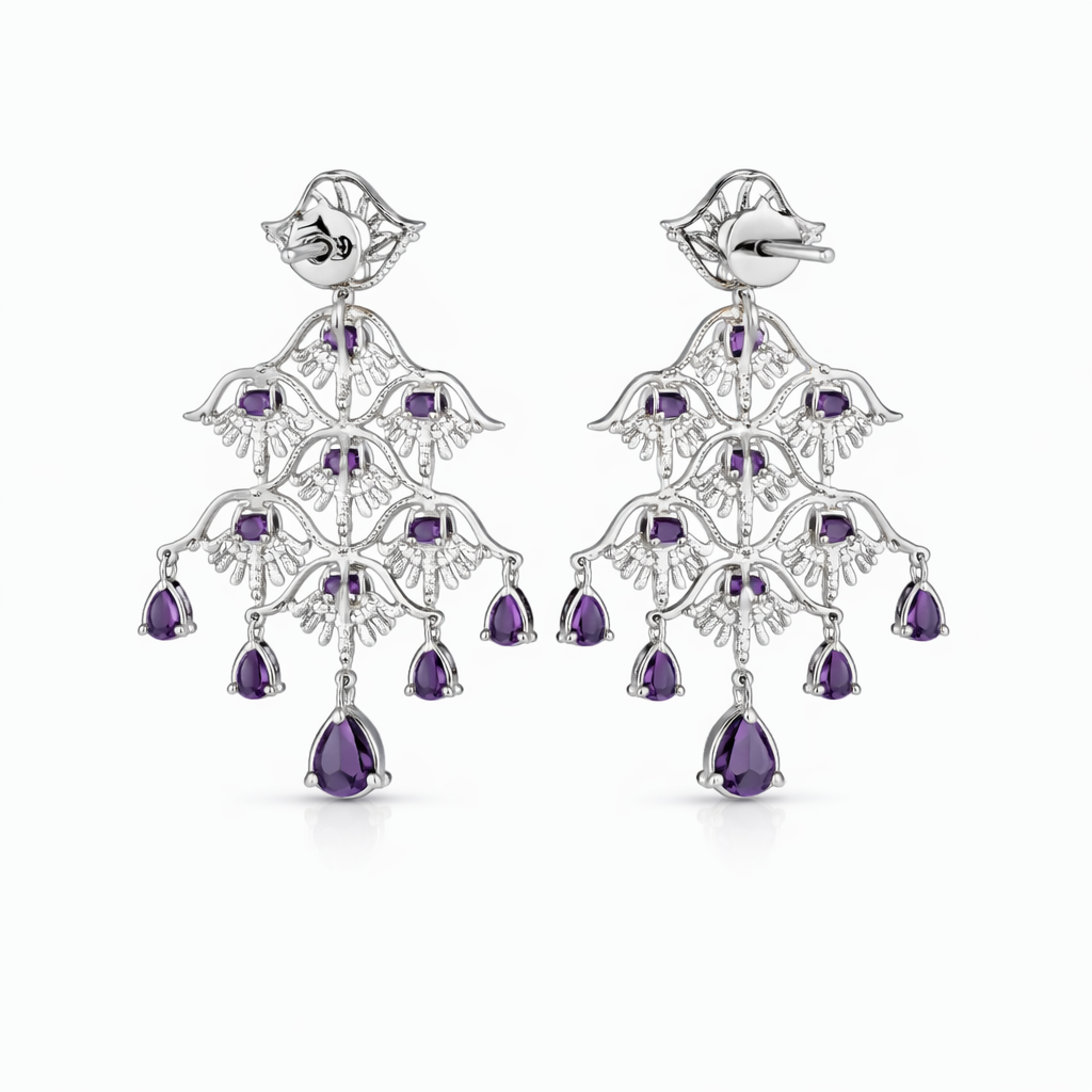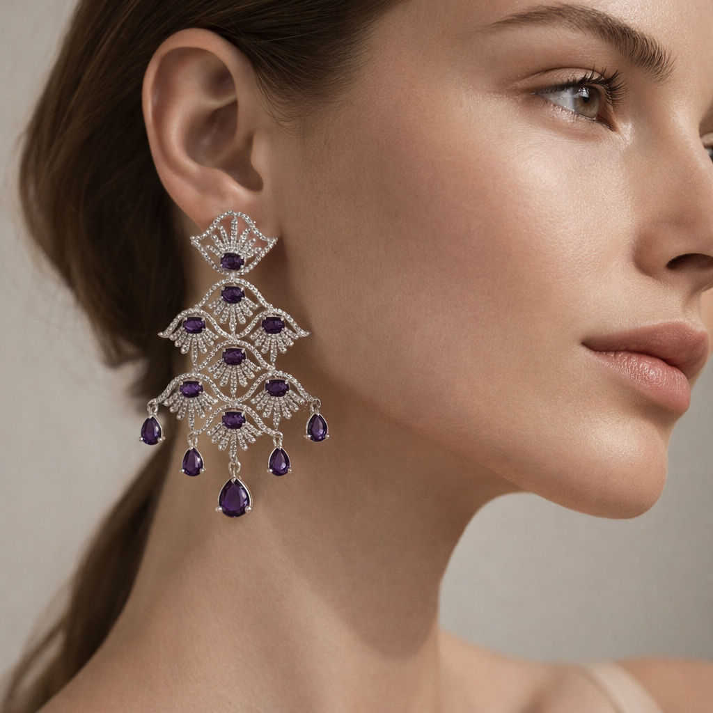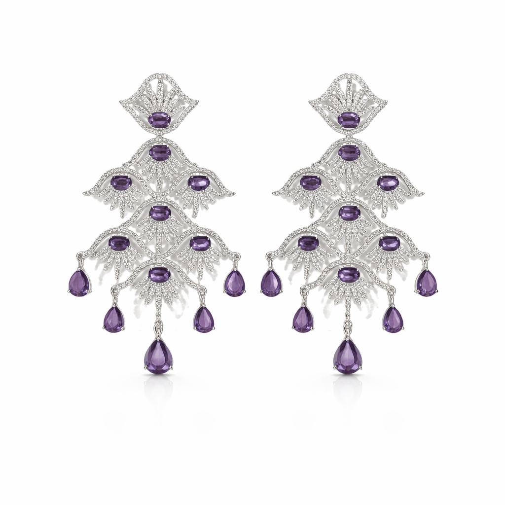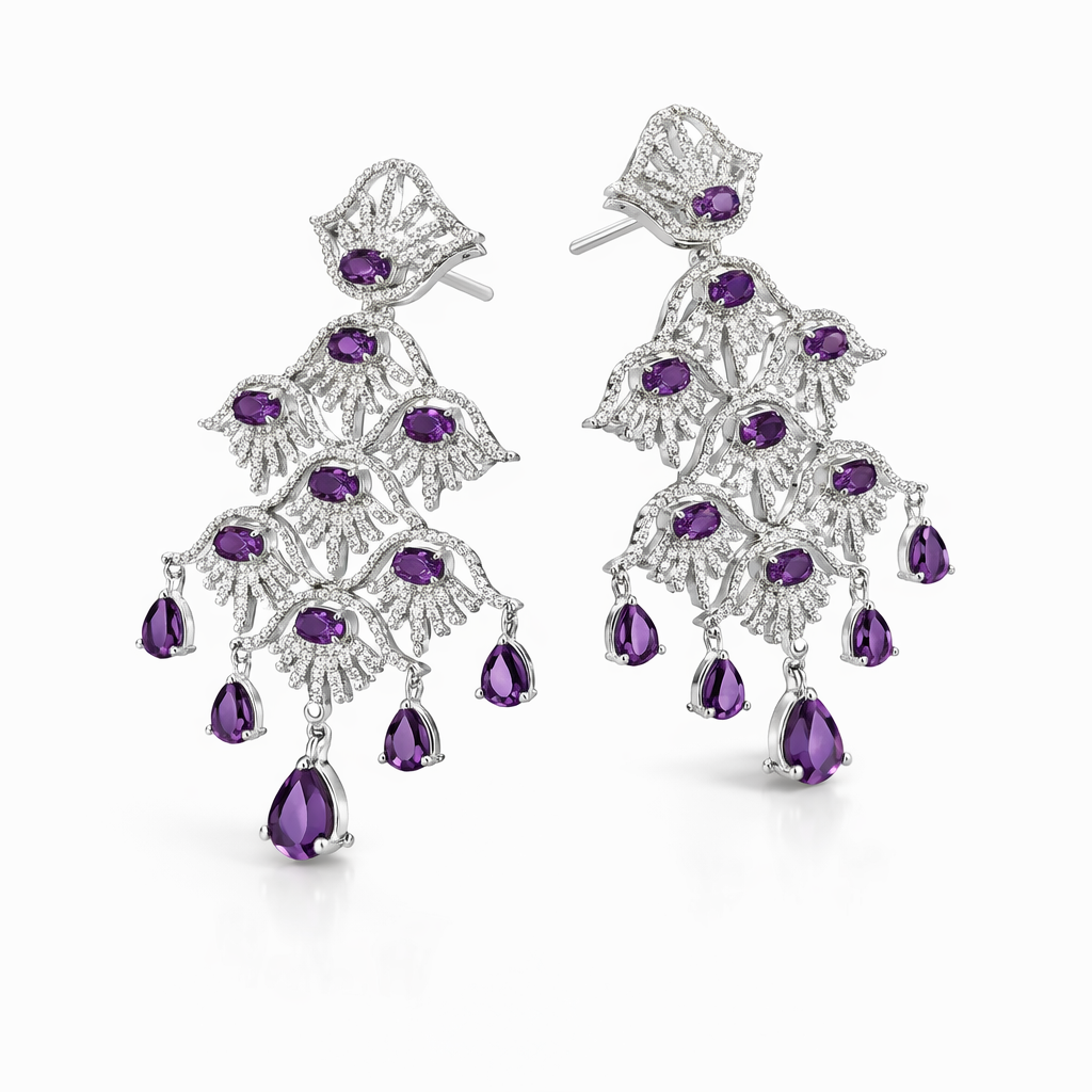 Make a graceful statement with these exquisitely designed amethyst-hued crystal statement earrings, where intricate craftsmanship meets modern elegance. Featuring a layered leaf-inspired silhouette, each tier is encrusted with shimmering crystals and highlighted with deep purple amethyst-tone stones that add richness and depth to the design.