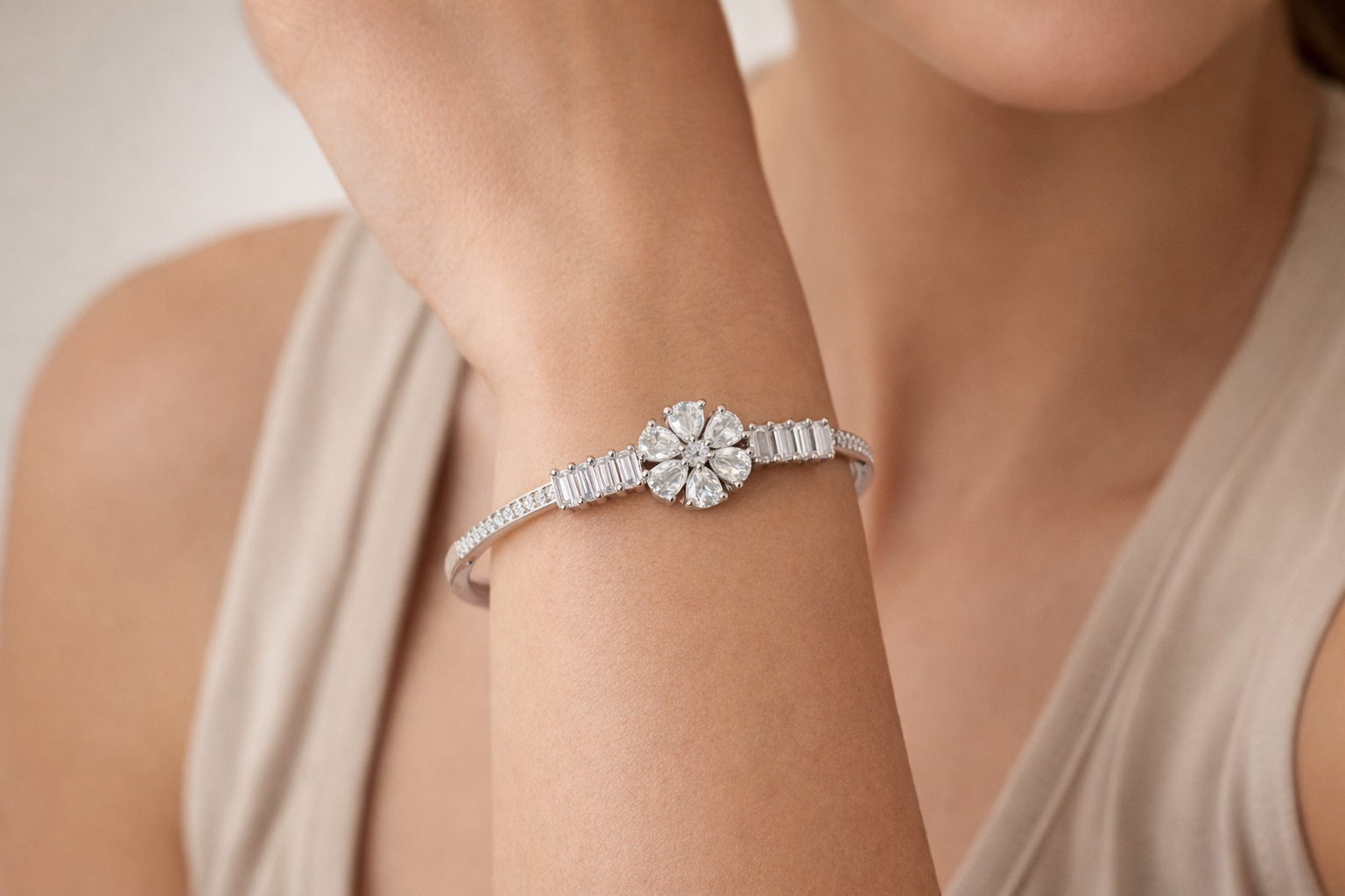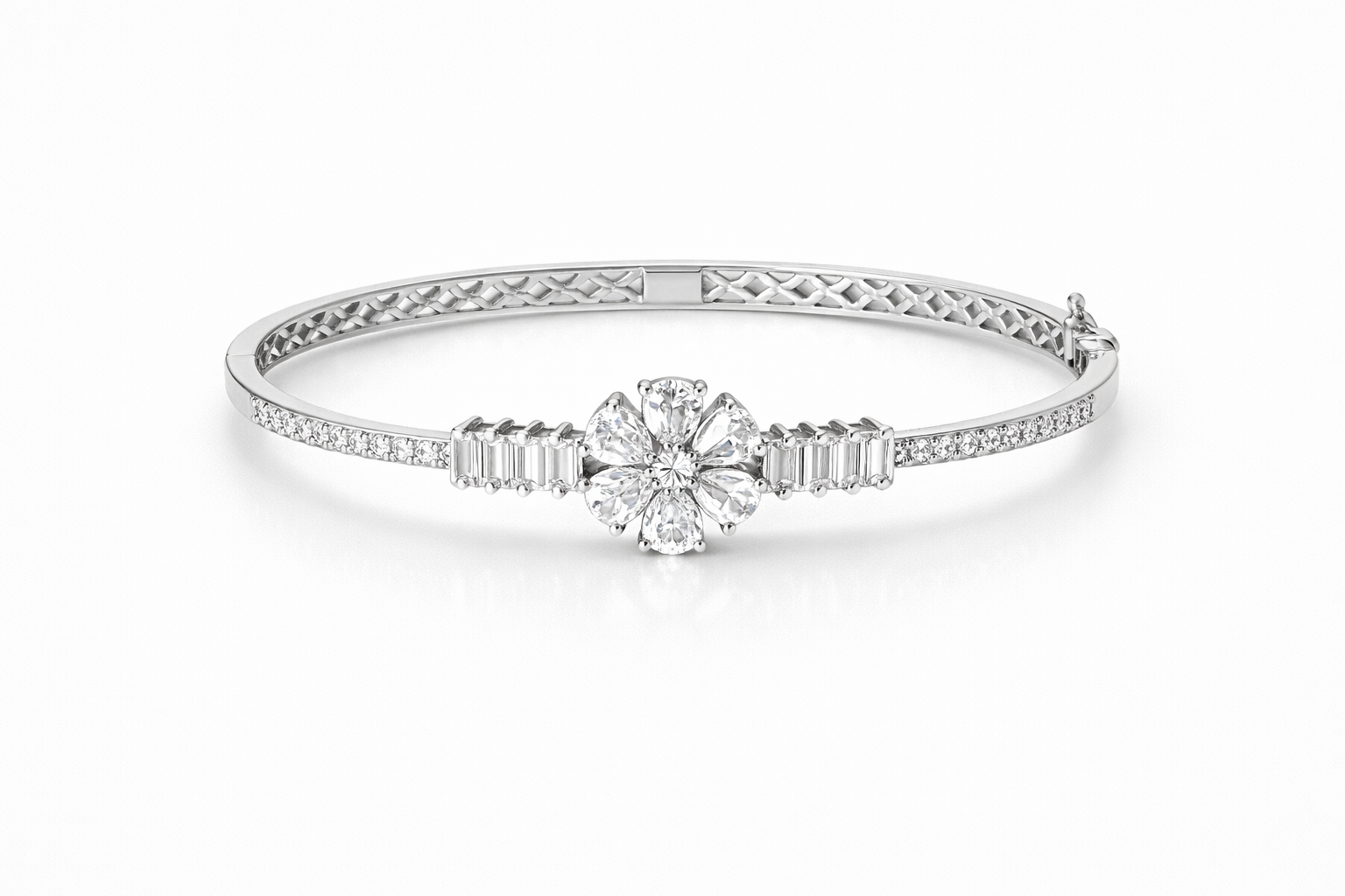 Grace your wrist with timeless sparkle through the Crystal Bloom Silver Bangle. Crafted with a sleek silver-tone finish, this bangle features a stunning floral centerpiece formed with precision-cut crystals that radiate brilliance. The baguette-style side stones add a refined architectural touch, enhancing its luxurious appeal.