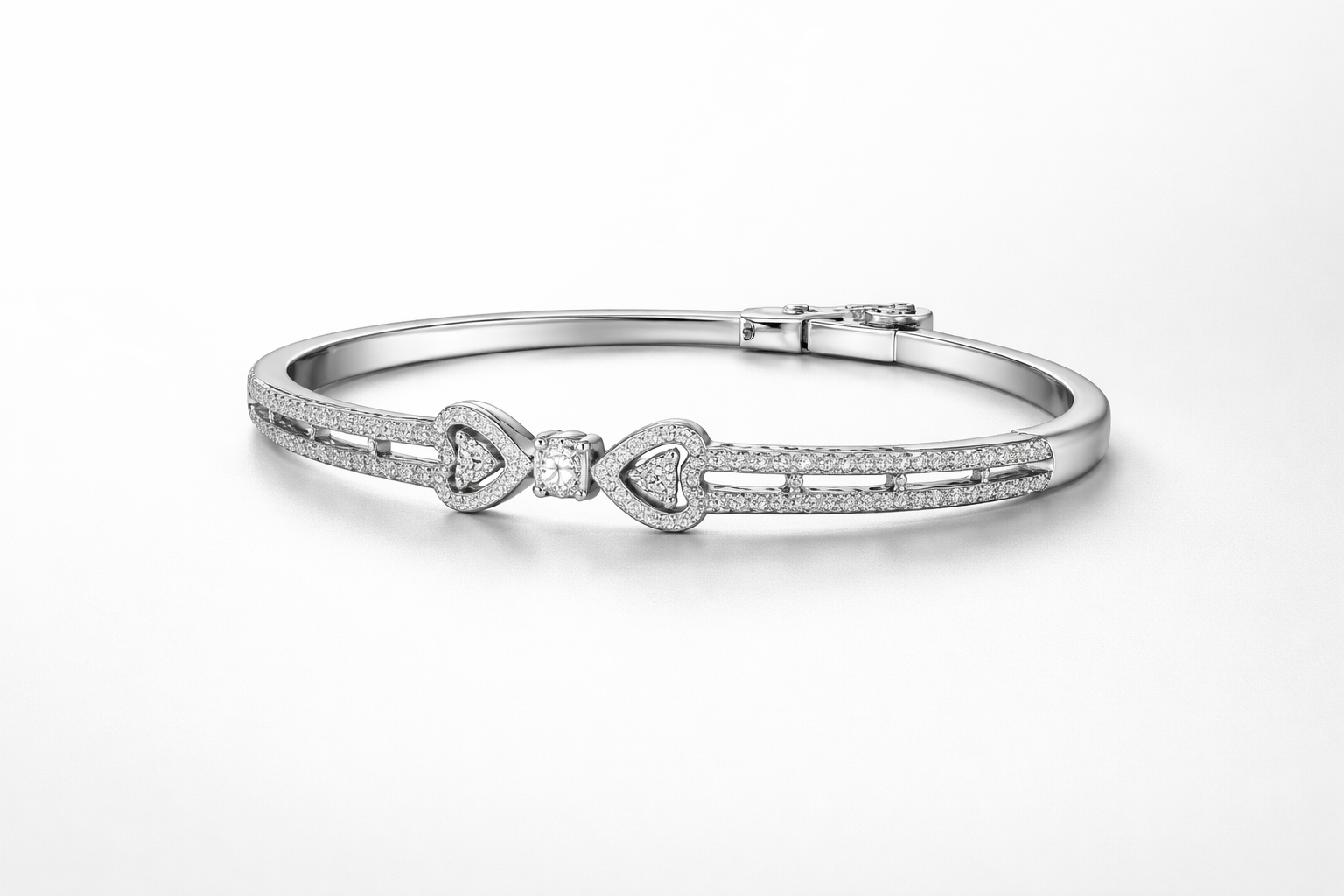 A refined expression of love and elegance, this premium heart-motif bangle is designed to add understated luxury to your everyday and occasion wear. Crafted with a sleek, polished finish, the bangle features delicately intertwined heart accents, encrusted with shimmering diamond-like stones that catch the light with graceful brilliance.