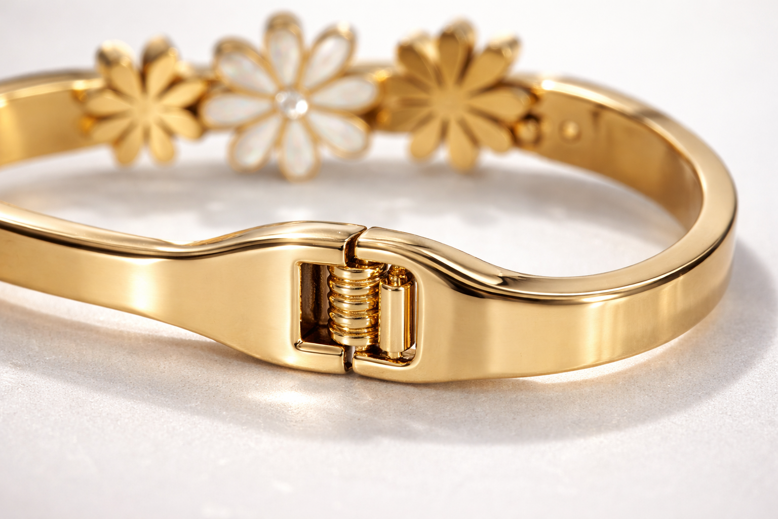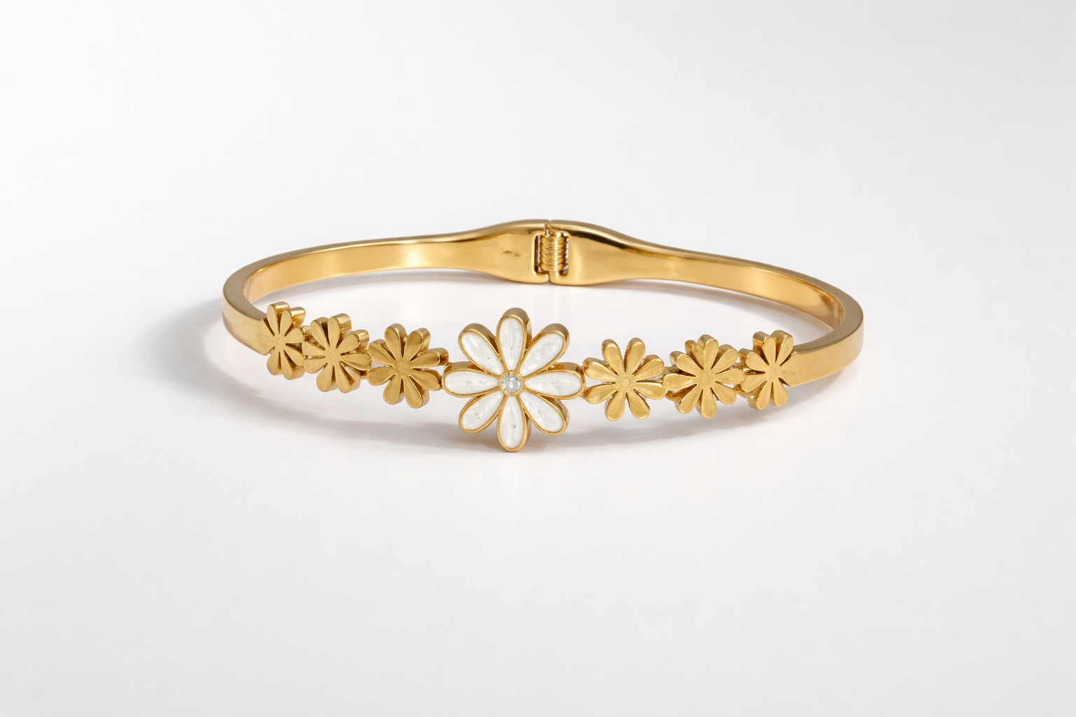Bring a touch of nature-inspired elegance to your look with this Floral Charm Gold Bracelet. Crafted in a sleek gold-toned finish, the bracelet features a row of delicate daisy motifs, highlighted by a central white enamel flower that adds a fresh, graceful charm. The minimalist floral detailing makes this piece perfect for everyday wear while still feeling special.