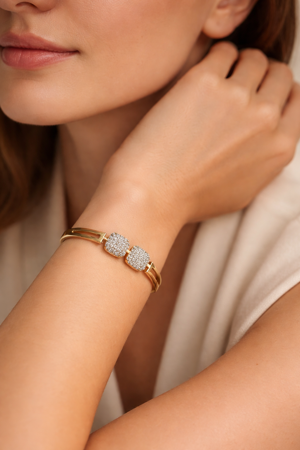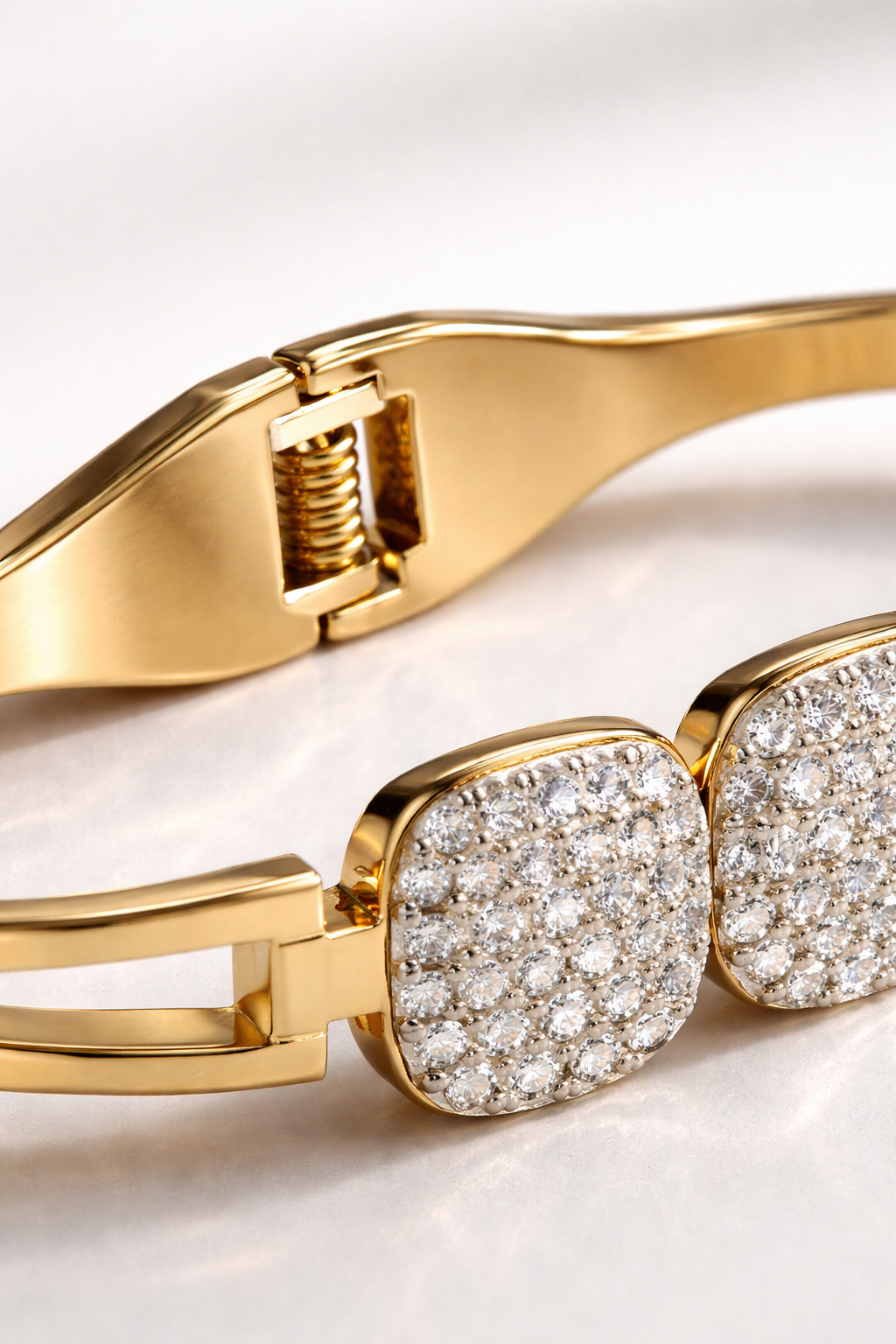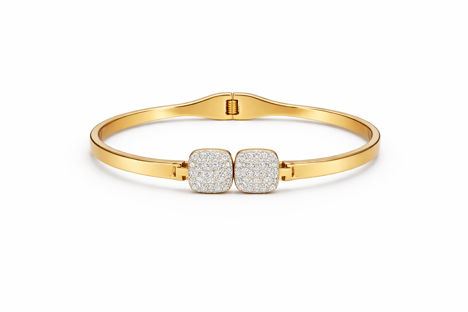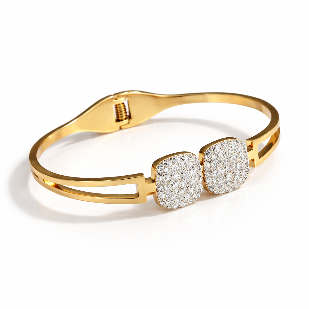 Sleek, modern, and effortlessly elegant, the Lumière Duo Crystal Bracelet by GLAZÉIA is designed for understated luxury. Crafted in a polished gold-tone finish, this refined bracelet features two square crystal-studded accents that add just the right amount of sparkle.