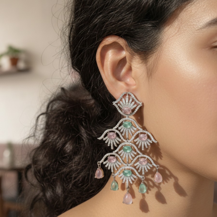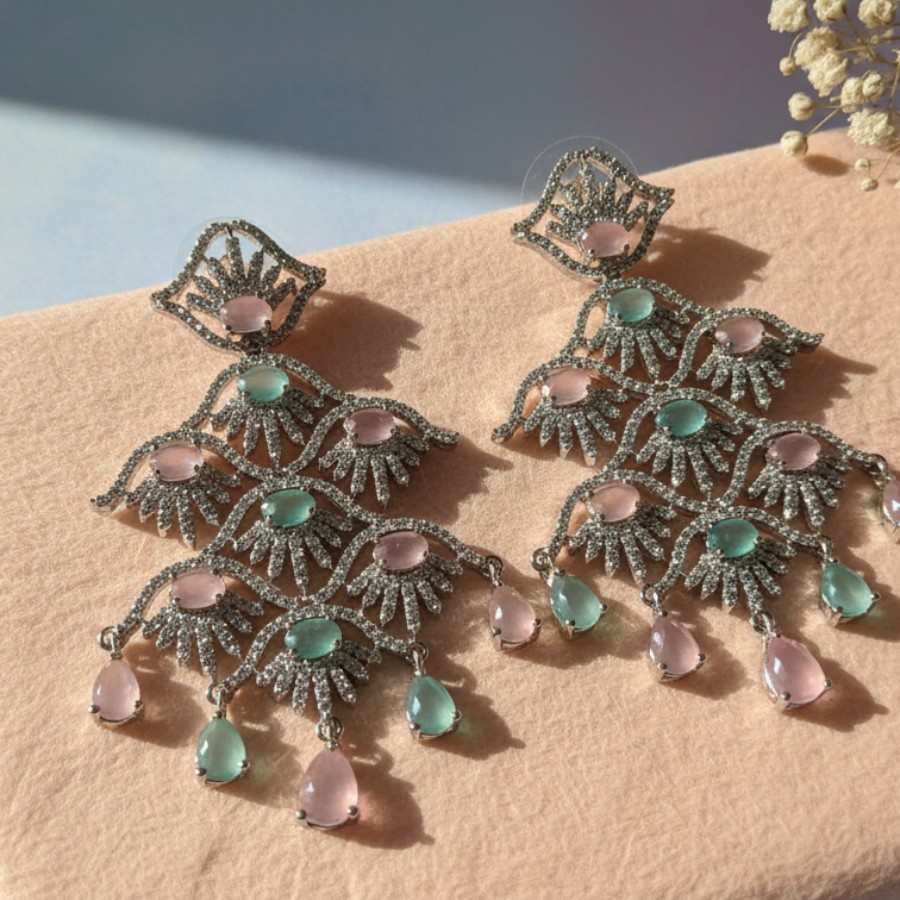An enchanting blend of delicate color and intricate craftsmanship, the Pastel Cascade Royale Earrings are designed to make a graceful statement. Featuring an elegant chandelier silhouette, these earrings are adorned with soft blush pink and serene mint-green stones, beautifully arranged in layered, fan-inspired motifs encrusted with shimmering pavé accents.