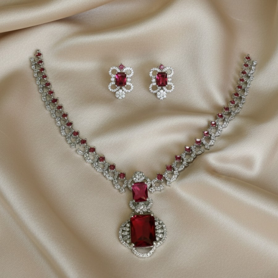 Make an unforgettable impression with the Ruby Royale Statement Necklace Set, crafted for elegance and grandeur. Featuring radiant ruby-red stones framed with shimmering crystal accents, this necklace is designed to captivate from every angle. The centerpiece showcases a bold rectangular stone surrounded by intricate detailing, perfectly balanced with a refined line of sparkling motifs.